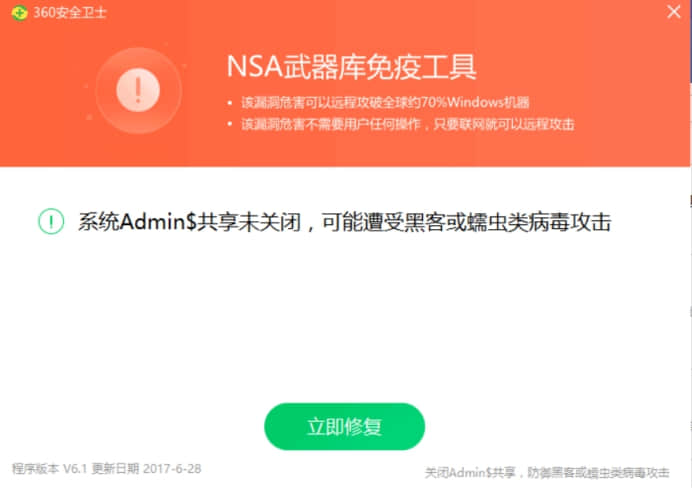 4. 安裝好NSA免疫工具后,它會讓您立刻修復(fù).點擊立刻修復(fù).