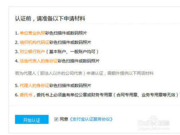 然后會提示你需要準(zhǔn)備什么資料。如圖所示,需要營業(yè)執(zhí)照,組織機(jī)構(gòu)代碼,對公銀行賬戶,法人身份證等。如果不是法人開店還需要:代理人身份證,委托書。
