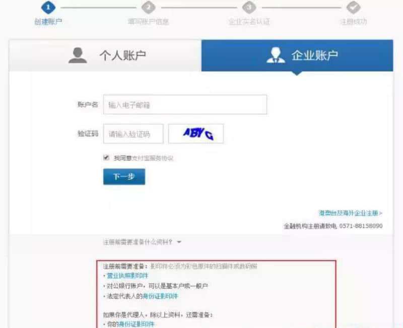 第三步:選擇"企業賬戶",按照要求輸入郵箱和后面顯示的驗證碼,完成后點擊下一步。紅色框選部分要特別注意,包括企業營業執照和對公銀行賬戶等資料的準確性。