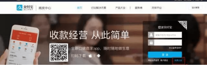 第二步:已有支付寶賬號的商戶可直接登陸,沒有商戶點擊右下角“注冊”。
