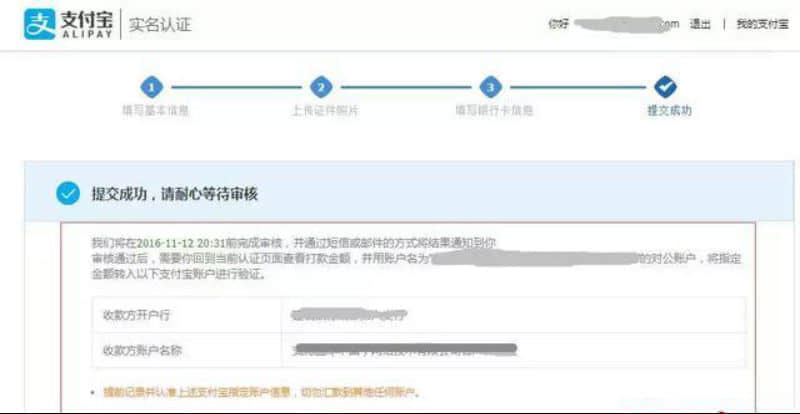 **步:2天內收到系統“審核完成”的提示之后,登陸賬號,并根據上面的提示,用之前提交的對公銀行賬戶向指定的支付寶收款賬戶充值1.08元,完成驗證。