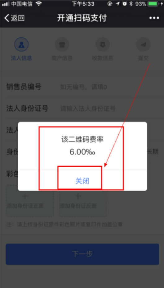 4、點(diǎn)擊進(jìn)入“開(kāi)通掃碼支付”頁(yè)面,此時(shí)系統(tǒng)會(huì)彈框提示“二維碼費(fèi)率為6.00‰(100元0.6元)”,不予理會(huì),直接點(diǎn)擊關(guān)閉即可。