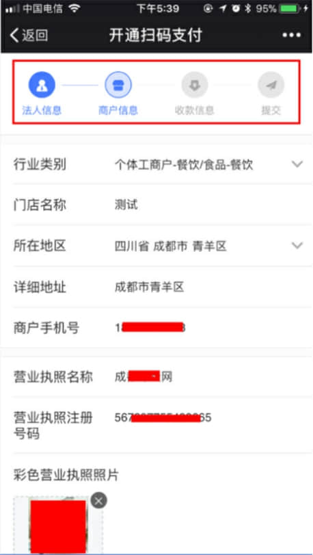 6、根據(jù)要求填寫(xiě)對(duì)應(yīng)的 法人信息、商戶(hù)信息、收款信息,填寫(xiě)完成后點(diǎn)擊提交。